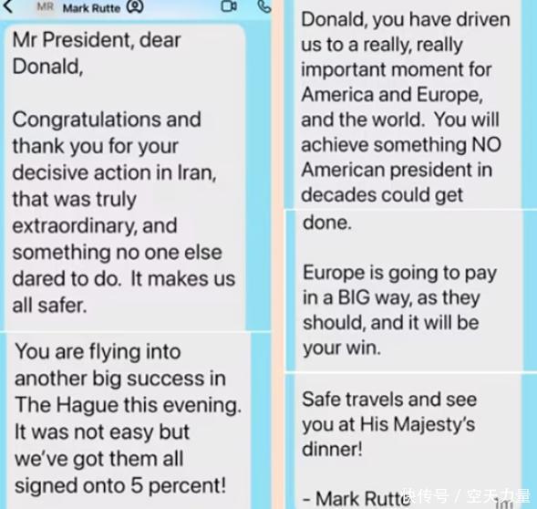 吕特在短信中恭维特朗普对伊朗的决定性行动,是其他人不敢做的事情,正迈向“一个伟大的胜利”,还提前替其他成员国做了保证,表示欧洲将掏一大笔钱(指国防开支),这是他们该做的。